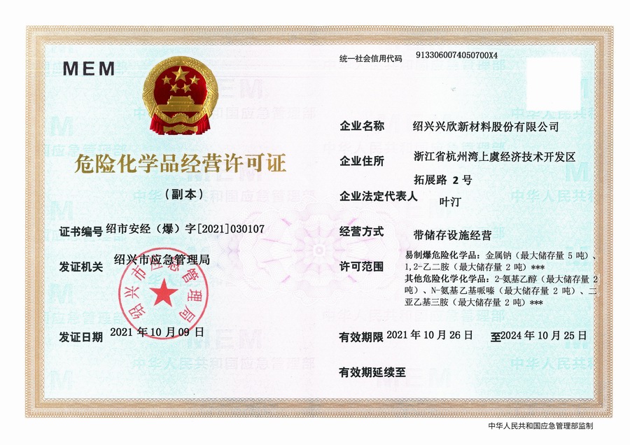 紹興興欣新材料股份有限公司成立于2002年06月27日,占地面積122畝,位于杭州灣上虞經(jīng)濟(jì)技術(shù)開發(fā)區(qū)拓展路2號,現(xiàn)有職工200余人,專業(yè)技術(shù)人員50余人;博士、碩士研究生30余人組成的一支知識型、專業(yè)化的技術(shù)科研團(tuán)隊。公司面向全球市場,專業(yè)開發(fā)電子化學(xué)品、環(huán)保化學(xué)品、醫(yī)藥中間體、高分子材料等先進(jìn)新材料重點領(lǐng)域的省級科技型企業(yè);建有浙江上虞、安徽東至兩個生產(chǎn)基地。目前為“國家高新技術(shù)企業(yè)”、浙江省“隱形冠軍”企業(yè)、浙江省專精特新中小企業(yè);建有“省級”研究開發(fā)中心,共建天津大學(xué)浙江紹興研究院電子化學(xué)品研發(fā)中心。